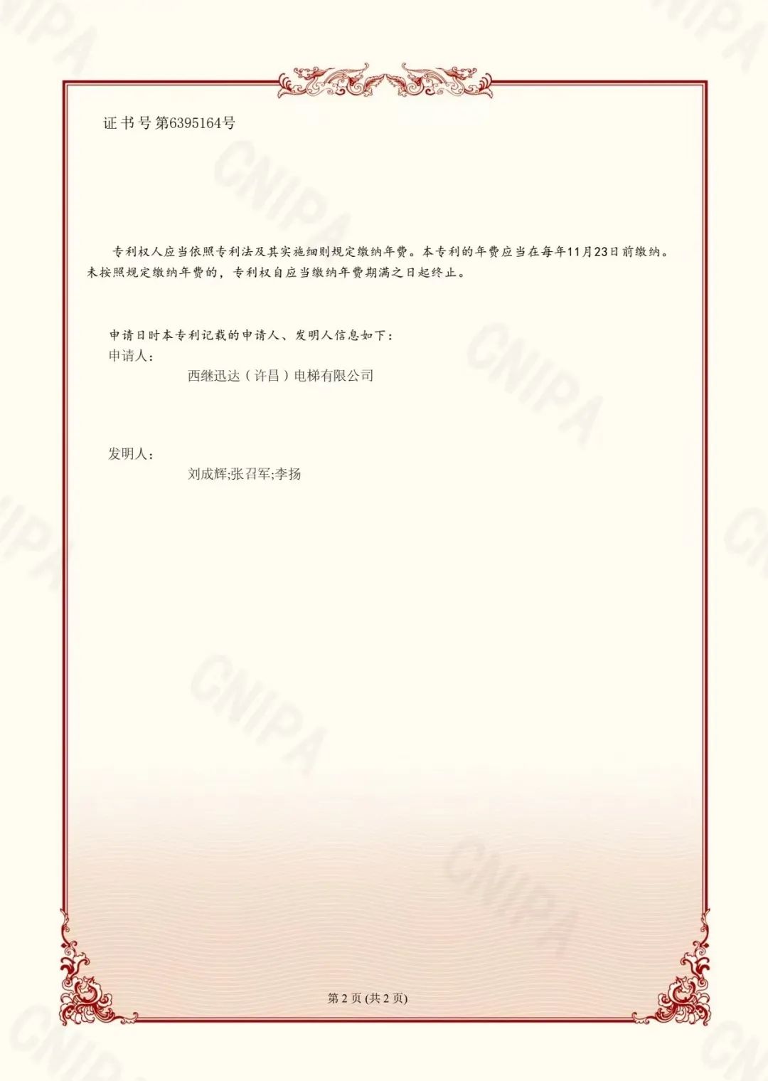 近期獲得的三項發(fā)明專利,帶上機(jī)械阻止裝置的一體式上梁,專利號ZL201811408505.6,專利申請日2018年11月23日,授權(quán)公告日為2023年10月13日,授權(quán)公告號CN109279471B;一種電梯驅(qū)動制動器電磁力測試裝置,專利號ZL201710717149.5,專利申請日2017年8月21日,授權(quán)公告號CN107462360B;背包式電梯導(dǎo)向系統(tǒng) ,專利號ZL201810491625.0,專利申請日2018年5月22日,授權(quán)公告號CN108423520B,授權(quán)公告日為2023年8月29日,專利權(quán)限均為二十年。三項專利的成功獲得,是西繼迅達(dá)倡導(dǎo)科技創(chuàng)新和技術(shù)革新的實(shí)踐成果,再次展現(xiàn)了集團(tuán)公司技術(shù)研發(fā)人員的科研素質(zhì)和能力。 截止目前,今年西繼迅達(dá)共獲得授權(quán)發(fā)明專利授權(quán)5項、發(fā)明專利公布7項,實(shí)用新型專利授權(quán)18項。
