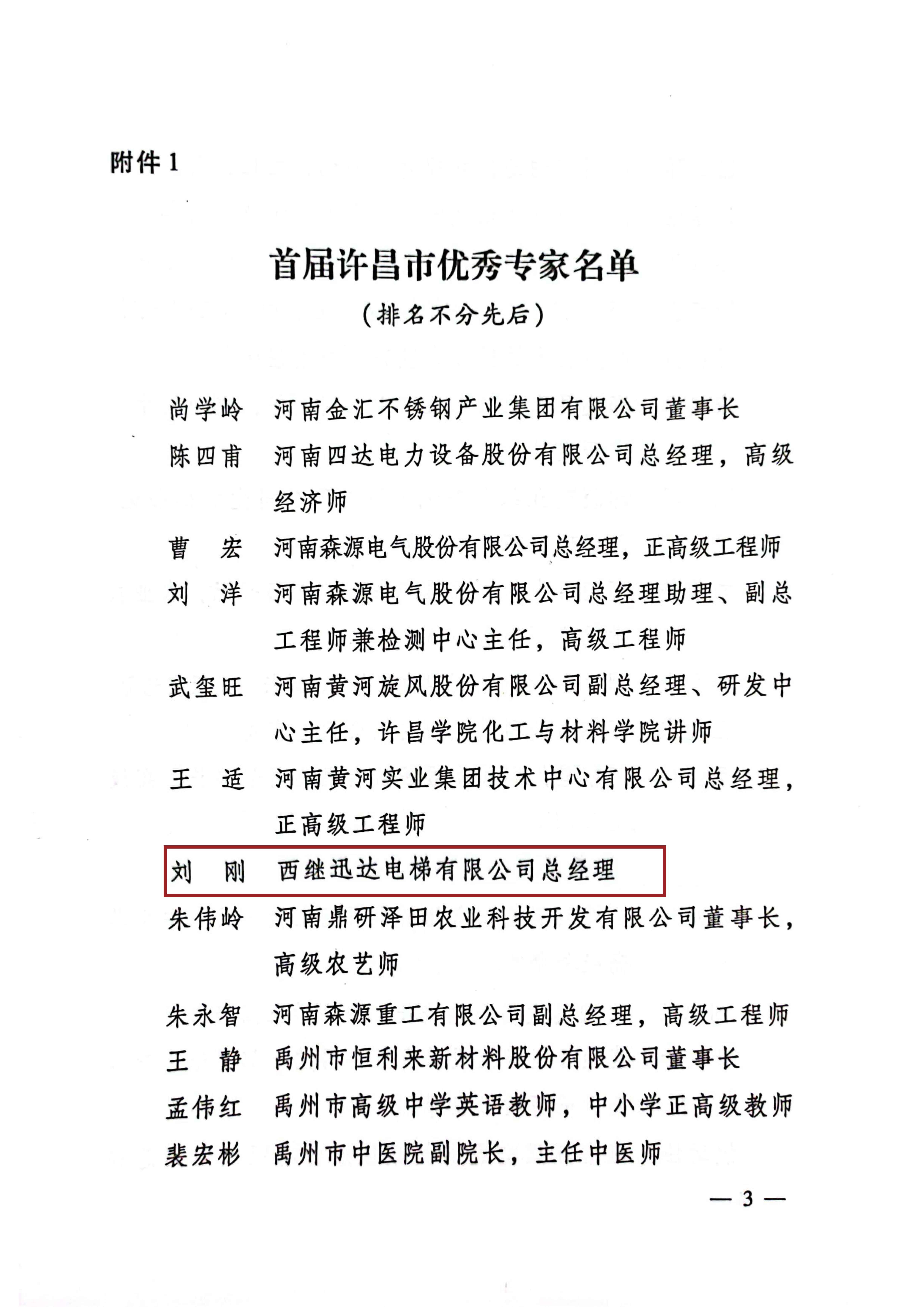 據悉,首屆許昌市優秀專家評選由中共許昌市委、許昌市人民政府共同發起,是為了深入貫徹落 實中央人才工作會議精神,進一步發現、識別、凝聚各行業各領域優秀人才,努力培養建設一支政治 堅定、業務精湛、結構合理、充滿活力的優秀人才隊伍,充分發揮人才在全市經濟社會發展和創新驅 動中的引領支撐作用。此次活動推薦對象為許昌市各行業各領域中的優秀專家,包括科技創新人才、 社會科學研究人才、企業經營管理人才、社會工作人才、農業鄉土人才、醫療衛生人才、教育教學人 才等,旨在深入實施許昌市人才優先發展戰略,大力營造“尊重勞動、尊重知識、尊重人才、尊重創造” 的良好社會氛圍,對于激發各類人才創新活力、促進許昌市經濟社會高質量發展具有重要意義。作為企業經營管理類優秀專家,劉剛總經理秉承“實干、執著、堅韌”的企業家精神,率領西繼 團隊拼搏奮進、開拓創新、追求卓越,引入世界500強企業——瑞士迅達集團的戰略投資,實現企業 跨越式發展,經歷 20多年的櫛風沐雨,將西繼迅達打造成為中西部及北部地區最大電梯服務型制造標桿企業,榮獲得多項國家級及省級榮譽。劉剛總經理系河南省第十三屆人大代表、河南省十二屆工商聯執委、許昌市第七屆政協委員。曾獲得中國電梯行業影響力 21人、許昌市優秀創新型企業家、許昌市優秀企業家、許昌市誠實守信道 德模范提名獎等榮譽稱號。