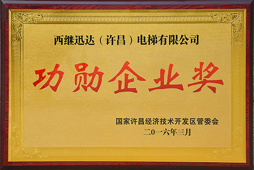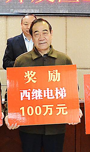 3月4日上午,在國家許昌經(jīng)濟技術(shù)開發(fā)區(qū)召開的2016年度工作會議上,西繼迅達(dá)電梯被開發(fā)區(qū)管委會授予“功勛企業(yè)獎”,開發(fā)區(qū)黨工委書記、管委會主任王民生親自為劉董事長頒發(fā)獎牌及獎金100萬。