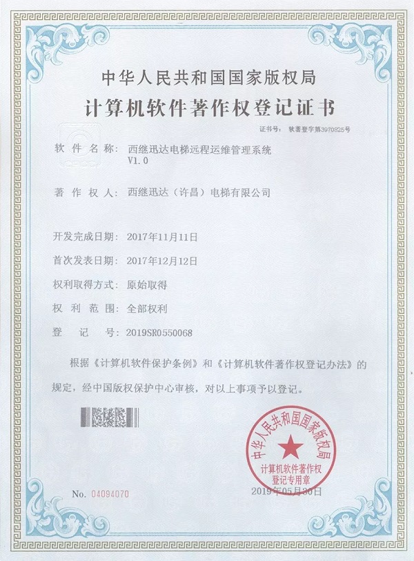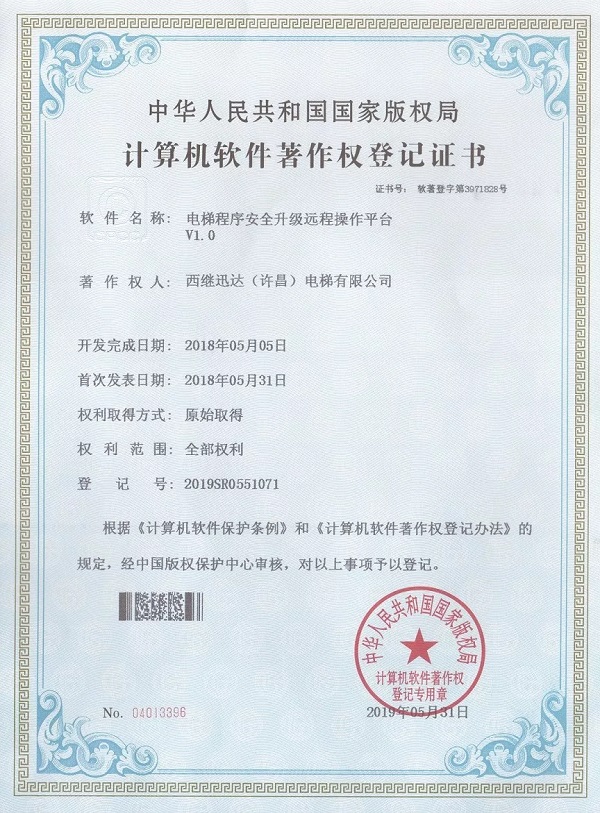 2019年5月31日,《電梯程序安全升級遠程操作平臺》被正式授予《中華人民共和國國家版權局計算機軟件著作權登記證書》,登記號為:2019SR0551071。