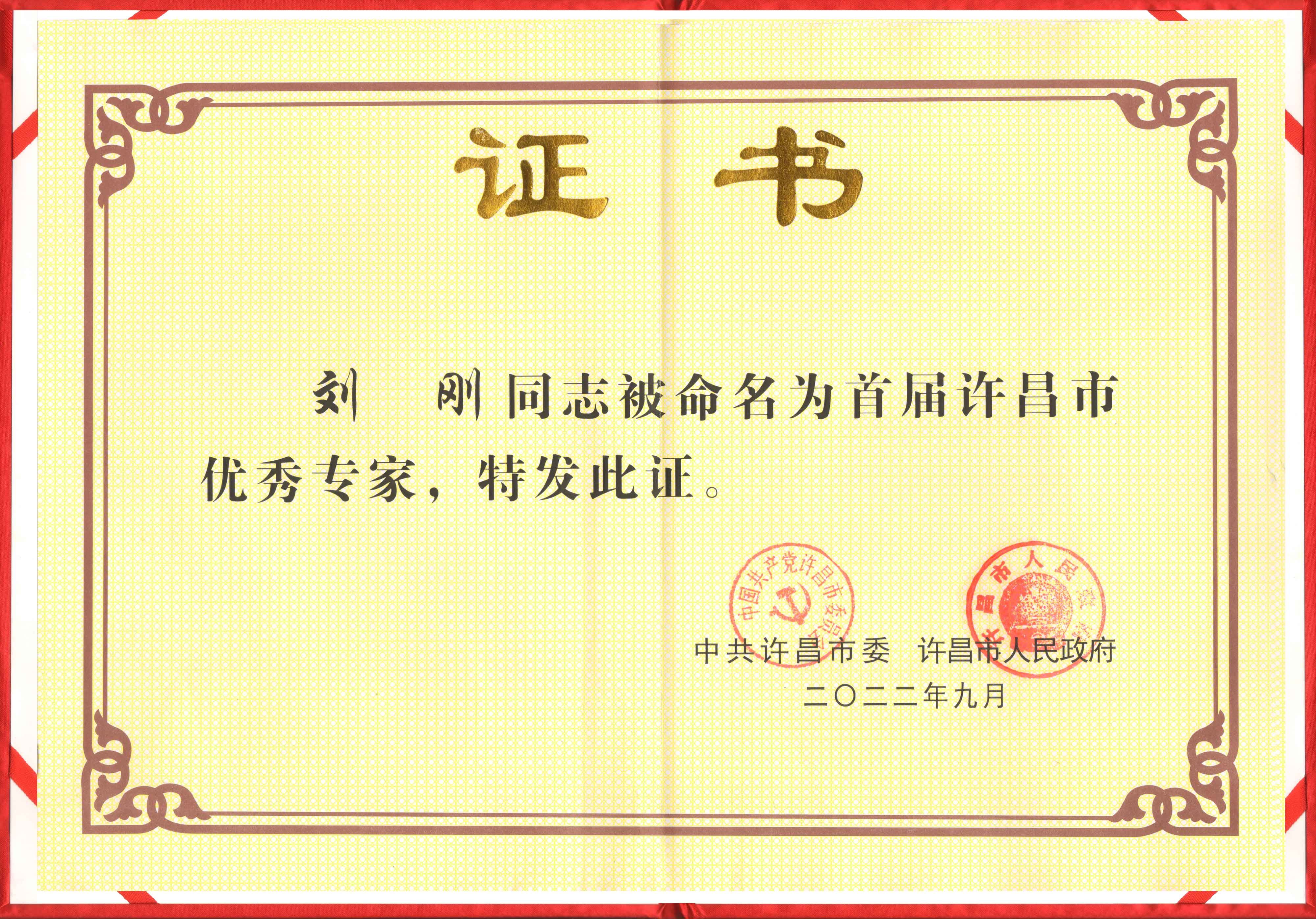 公司總經(jīng)理劉剛榮獲首屆許昌市優(yōu)秀專家